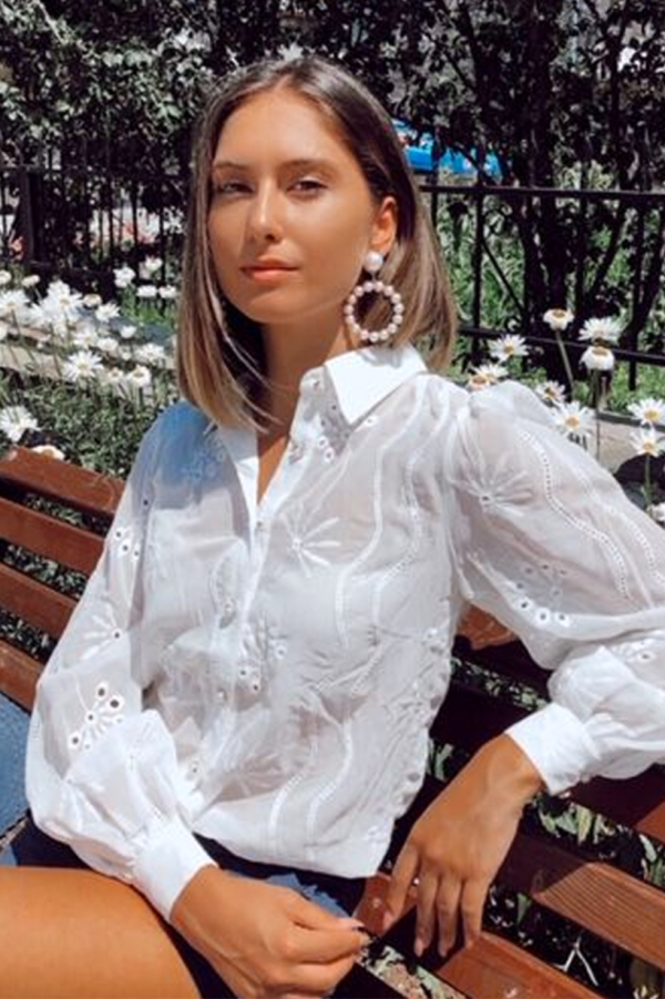 You can never have enough button-up shirts in your wardrobe. Our Elise Blouse has long sleeves, a centre-front button opening and perforated patterns throughout the garment.